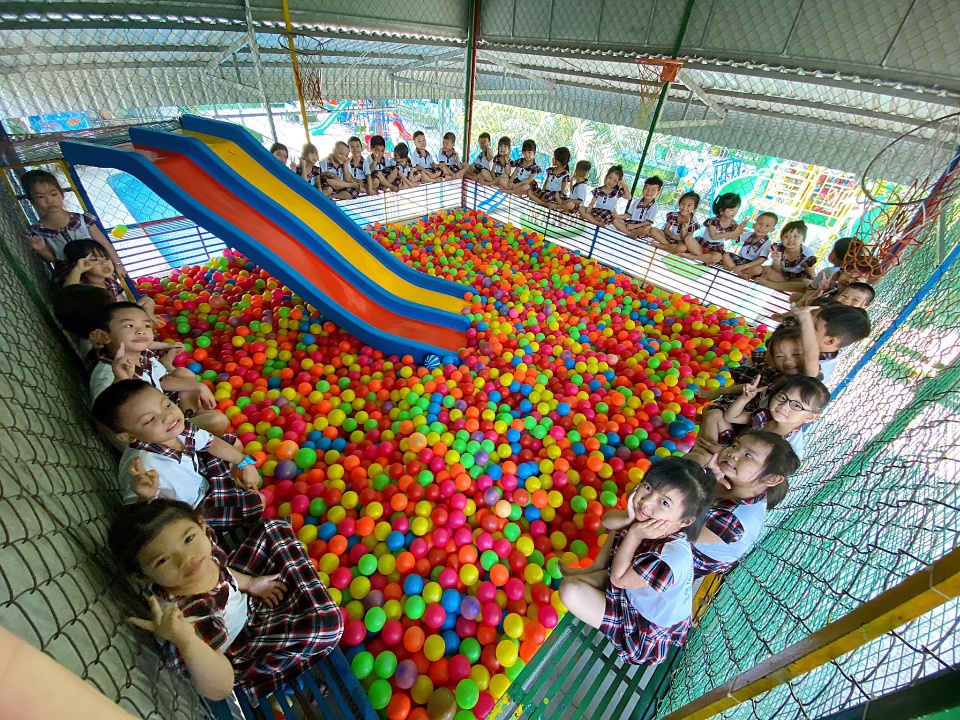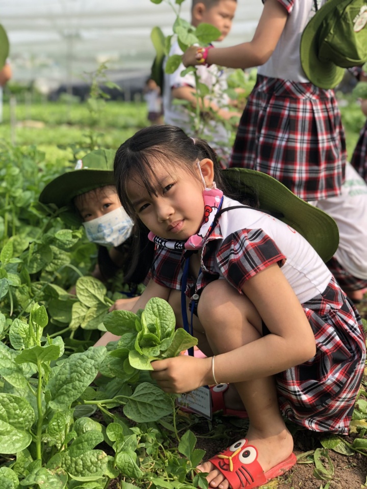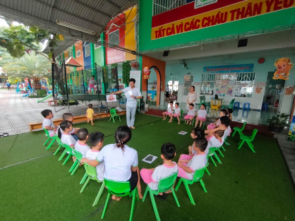 Bé đi học về rất ngoan, trường rộng rãi thoáng mát. Cô giáo thân thiện vui vẻ
